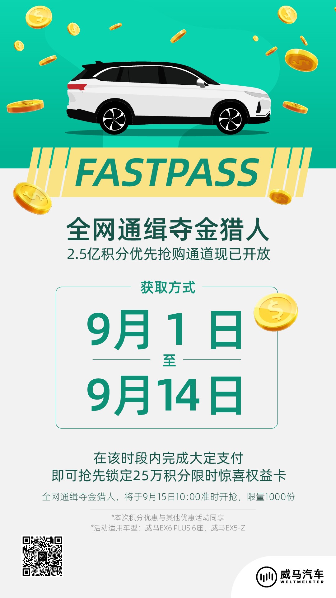 9月1日至9月14日,完成大定支付的用户可享优先特权,赢取250,000积分限量购车礼遇