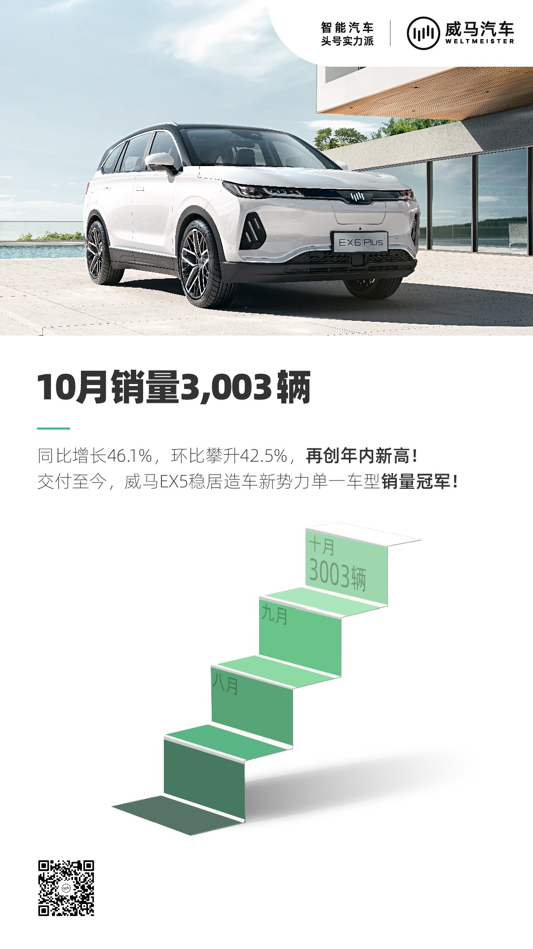 威马汽车10月销量3,003辆,同比增长46.1%,环比攀升42.5%,再创年内新高!