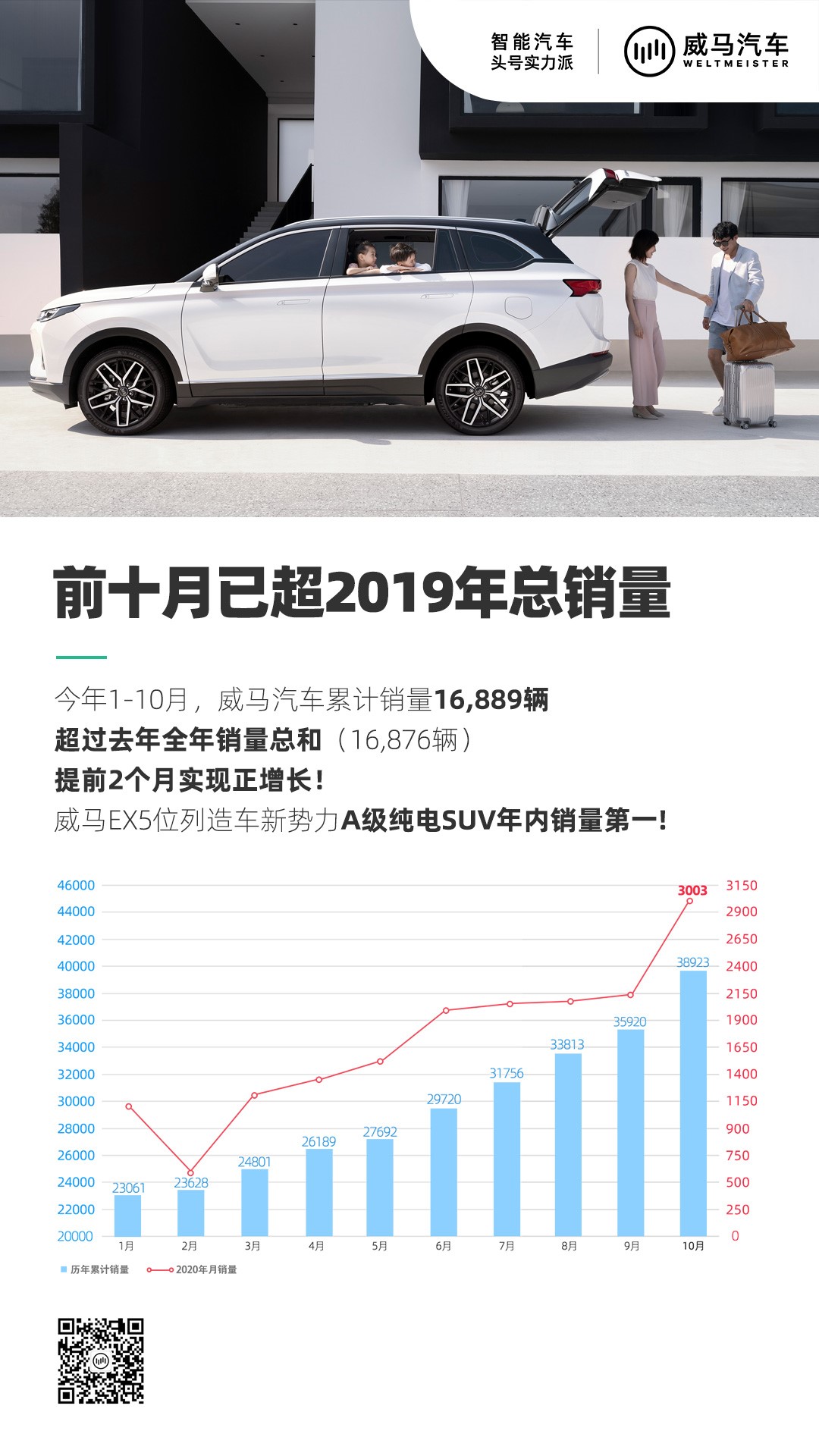 今年1-10月,威马累计销量达16,889辆,超过去年全年销量总和,提前2个月实现了销量同比正增长!