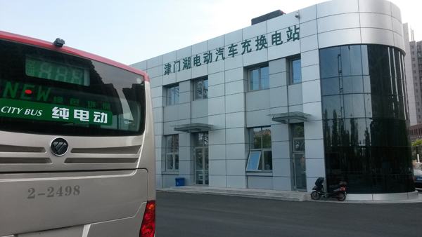 一辆纯电动公交车即将驶入津门湖电动汽车充换电站。