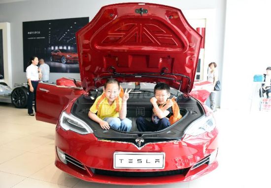 5月20日,电动汽车“特斯拉”(中国)公司在位于北京亦庄的体验中心举办“绿色科技儿童互动活动”,邀请少年儿童前来近距离体验该公司的Model S电动汽车,培养孩子们对高科技产品的兴趣。图为两名男孩钻进