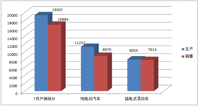 根据中汽协统计,7月新能源汽车生产19307辆,销售16884辆,同比分别增长2.2倍和3.3倍。其中纯电动汽车产销分别完成11252辆和8970辆,同比分别增长1.7倍和3.3倍;插电式混合动力汽车产销分别完成8055辆和7914辆,同比均增长3.4倍。