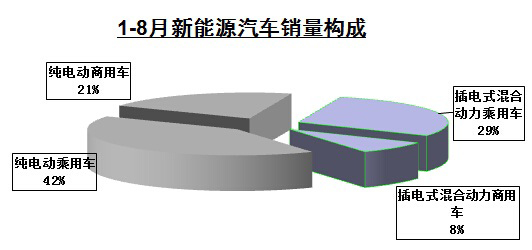 1-8月,新能源汽车共生产118020辆,销售108654辆,同比分别增长2.6倍和2.7倍。其中,纯电动汽车产销量分别为74727辆和68316辆,同比分别增长2.9倍和3.4倍;插电式混合动力汽车产销量分别为43293辆和40338辆,同比增长2.1倍和2倍。