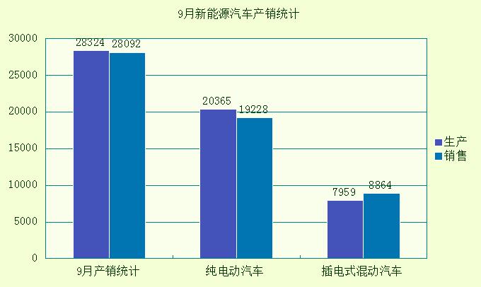 据中汽协数据统计,9月新能源汽车生产28324辆,销售28092辆,同比增长分别达2.1倍和2.2倍。其中,纯电动汽车产销量分别达20365辆和19228辆,同比增长分别达2.7倍和2.9倍;插电式混合动力汽车产销量分别为7959辆和8864辆,同比增长分别为1.1倍和1.3倍。