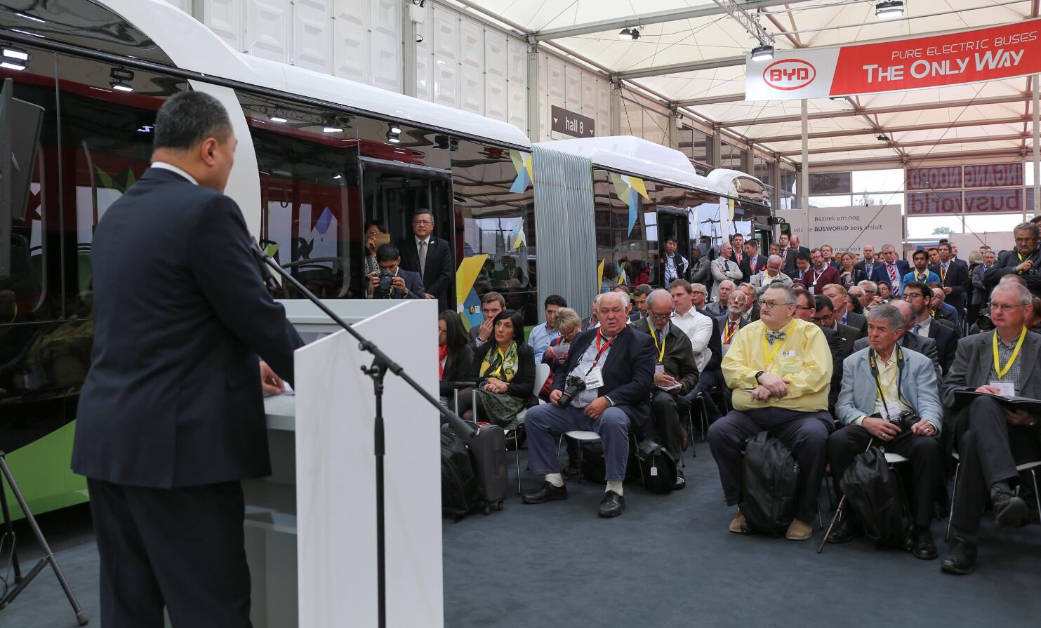 2015年10月16日-21日,比亚迪携世界首台纯电动双层大巴,18米铰接式纯电动大巴,12米纯电动单层大巴及8米纯电动中巴的强大阵容,震撼出席了在比利时科特赖克举行的2015年世界客车博览会(Busworld Kortrijk 2015)。