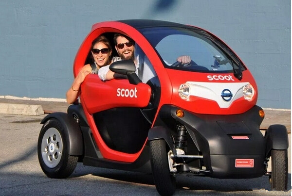 Scoot是一家旧金山电动自行车出租平台,主要是为市内短距离出行的用户提供服务,像是国内的公共自行车租赁服务。被称作电动摩托车界的Zipcar。近日,Scoot 跟尼桑公司合作推出了一款小型四轮双座电动车,供用户租赁使用。
