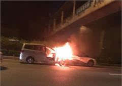 面包车追尾纯电动出租起火