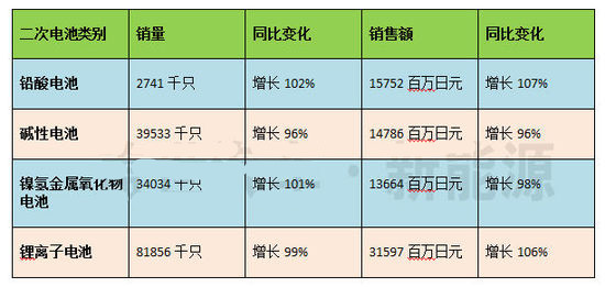 二次电池的出口总量为92565千只,同比增长86%,出口额为31455百万日元,同比增长84%。其中铅酸电池的出口总量为146千只,同比增长122%,出口额为1018百万日元,同比增长125%;镍镉电池的出口总量为2799千只,同比增长54%,出口额为252百万日元,同比增长51%;镍金属氢化物电池的出口总量11934千只,同比增长141%,出口额为4988百万日元,同比增长99%;锂离子电池的出口总量为71717千只,同比增长79%,出口额为19787百万日元,同比增长91%。