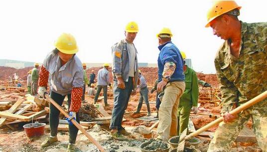 在涂装车间项目施工现场,数十名工人在安装模板,工人采用接力的方式,一桶一桶传递水泥。天气较为炎热,工人们满头是汗。施工人员中,一位女工人正和其他男工人用铁锹铲水泥(如图),引起记者的注意。她叫徐翠妹,来自浙江湖州,她说,自己和爱人一起在工地干活,“五一”节到了,虽然想家,但是工期安排比较紧凑,要跟着队伍一起赶工。