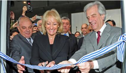 乌拉圭总统(右一)及乌拉圭工业能源部部长(中)为比亚迪纯电动大巴正式运营剪裁(图片来源于Presidencia)