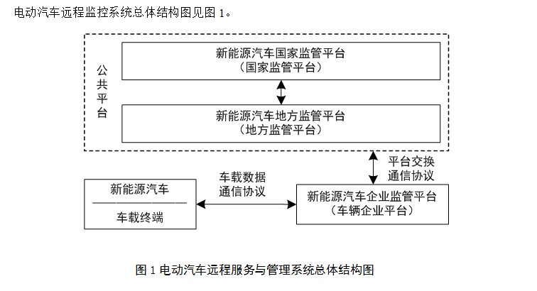 3.3 电动汽车远程服务与管理系统由公共平台(包括国家监管平台和地方监管平台)、企业平台和车载终端组成。