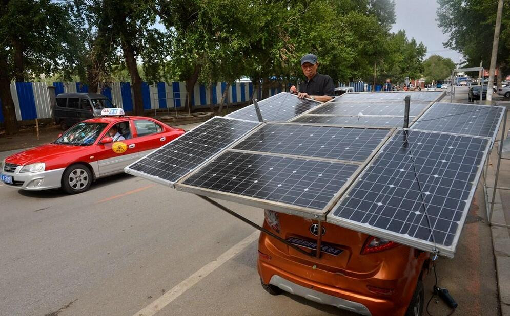 6月1日,午后阳光灿烂,柳绿荫打开汽车背着的太阳能电池板蓄电,然后把电火锅支起来。他说:“可不能浪费了太阳能,咱们就用太阳能产生的电能涮火锅吧……”