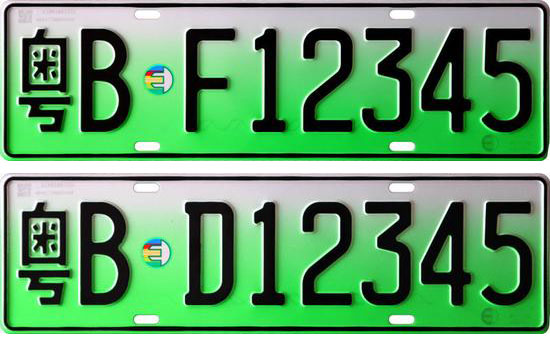 根据公安部网站消息,新能源汽车号牌按照不同车辆类型实行分段管理,字母"D"代表纯电动汽车,字母"F"代表非纯电动汽车(包括插电式混合动力和燃料电池汽车等)。小型汽车号牌中"D"或"F"位于号牌序号的第一位,大型汽车号牌中"D"或"F"位于号牌序号的最后一位。
