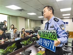 昨日,市交警局民警向记者介绍新能源车牌(上)与普通车牌(下)的区别。
