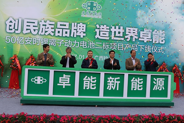 1月9日,钦州市钦北区皇马工业园广西卓能新能源50亿安时锂电池二标项目产品下线,标志着广西卓能新能源科技扩产成功。广西卓能新能源科技有限公司于2013年8月签约落户皇马工业园一区,主要建设50亿安时锂离子动力电池,以及10万套新能源汽车电源产业化项目。项目总规划用地2000多亩,分三期建设,一期已落实用地450亩,二、三期预留用地1900亩,预计总投资100亿元。