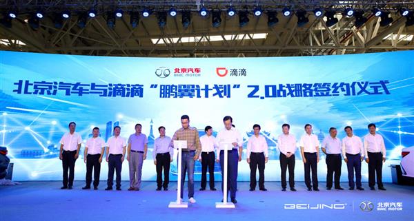 北汽营销公司副总经理卜红升与滴滴出行高级总监杨波签署合作协议,