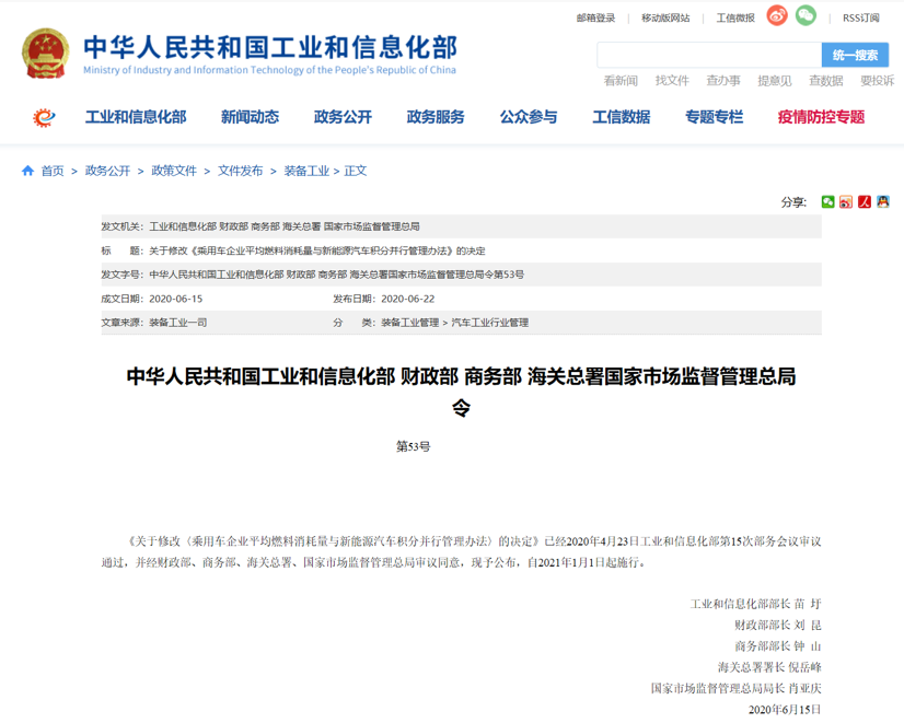 【EV视界综合报道】6月22日,工信部联合财政部、商务部等五部门发布了《关于修改〈乘用车企业平均燃料消耗量与新能源汽车积分并行管理办法〉的决定》(简称“新版双积分政策”),新政将于2021年1月1日起实施。