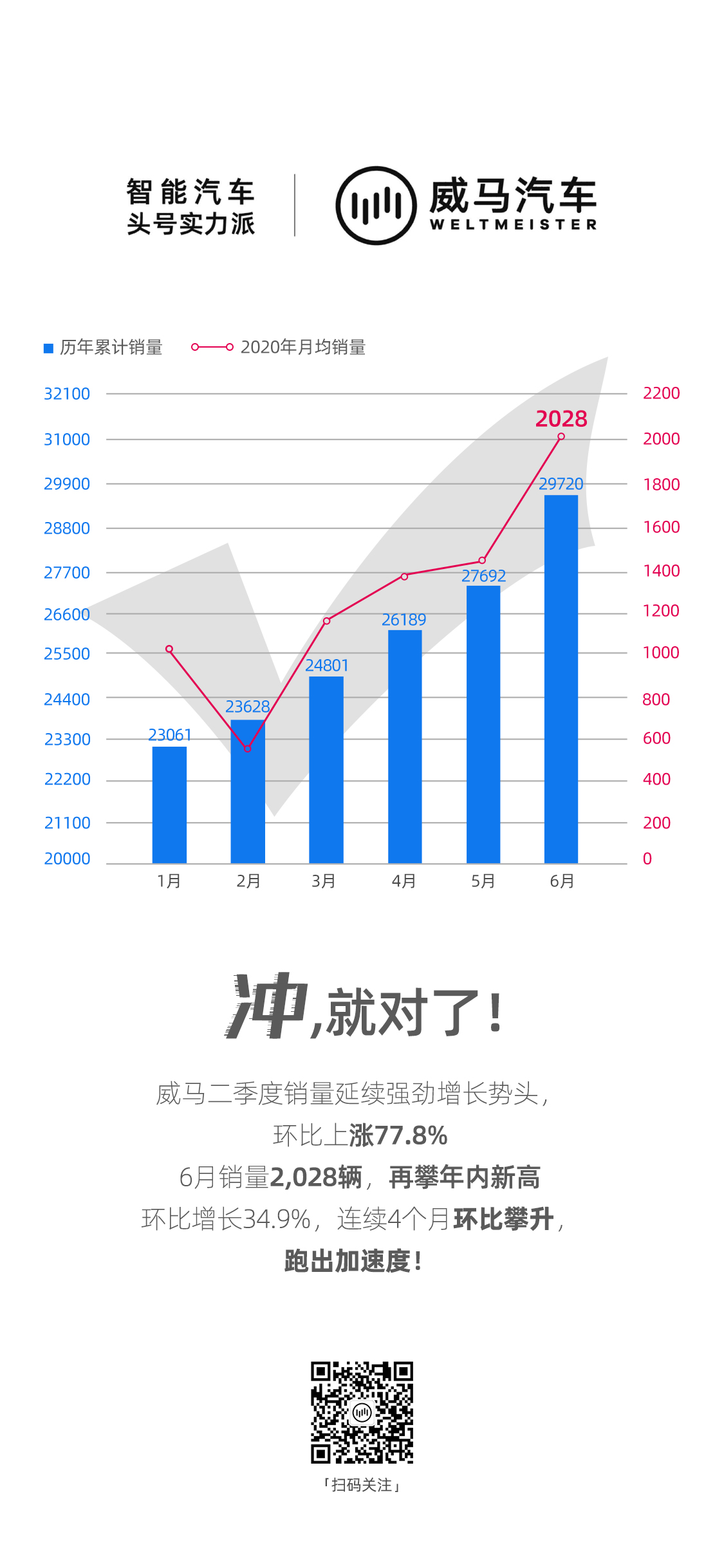 作为智能汽车头号实力派,威马汽车在疫情“黑天鹅”冲击下,二季度销量延续逆势增长的强劲势头,累计销量环比上涨77.8%,跑出增长加速度!根据乘联会数据统计,威马汽车6月销量2,028辆,再攀年内新高峰,环比增长34.9%,已连续4个月环比大幅攀升。