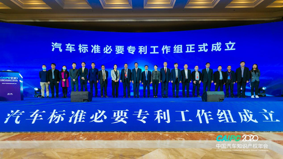 2020年10月12日,在陕西省宝鸡市举行的“2020中国汽车知识产权年会”上,在国家知识产权局、国家市场监管总局反垄断局等领导的共同见证下,来自中国汽车技术研究中心有限公司、中国汽车工程学会、中国信息通信研究院以及国内外二十余家汽车和通信企业的代表齐聚一堂,共同见证“汽车标准必要专利工作组”的成立仪式。