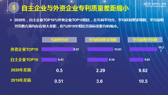 2020年,自主企业TOP10与外资企业TOP10相比,在专利平均分、平均权利要求项数、平均说明书页数方面均存在较大差距,但与2019年相比各指标差距均有缩小。