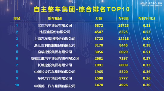 自主整车集团综合得分排名中,排名前十的整车集团依次为北京汽车集团有限公司、比亚迪股份有限公司、上海汽车集团股份有限公司、浙江吉利控股集团有限公司、奇瑞控股集团有限公司、安徽江淮汽车集团控股有限公司、长城控股集团有限公司、中国长安汽车集团有限公司、东风汽车集团有限公司、中国第一汽车集团有限公司。其中比亚迪股份有限公司综合得分4547分,专利平均分为0.53,专利质量相对较高。