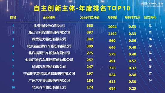 自主创新主体年度得分排名中,比亚迪股份有限公司以533分排名第一,吉利控股集团以397分排名第二;相较2019年,企业名次变化较大,潍柴动力、长城汽车、宁德时代、广汽集团股份、一汽股份名次提升明显,其中潍柴动力名次提升6位,位居第三名。