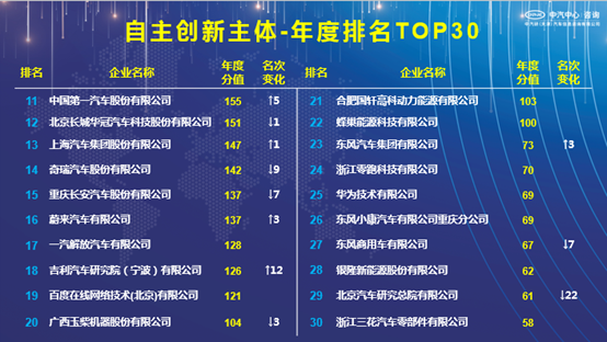 3、自主创新主体年度得分排名TOP30中,相较2019年企业名次变化较大,潍柴动力、长城汽车、宁德时代、广汽集团股份、一汽股份名次提升明显