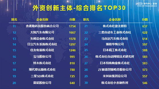 外资创新主体综合得分排名中,TOP10企业依次为丰田自动车株式会社、罗伯特·博世有限公司、通用汽车环球科技运作有限公司、本田技研工业株式会社、福特全球技术公司、株式会社电装、现代自动车株式会社、日产自动车株式会社、大众汽车有限公司、爱信精机株式会社。丰田自动车株式会社以10646分的绝对优势排名第一。