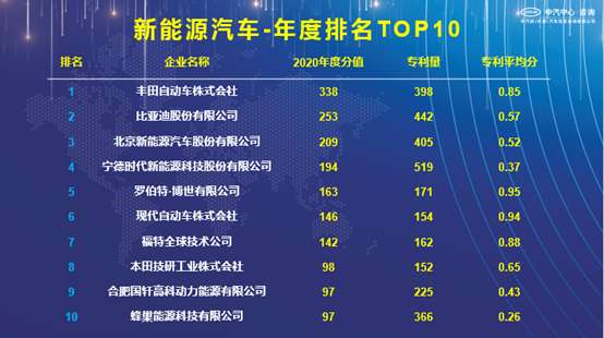 自主创新主体综合得分排名中,TOP10企业依次为比亚迪股份有限公司、浙江吉利控股集团有限公司、奇瑞汽车股份有限公司、北汽福田汽车股份有限公司、安徽江淮汽车集团股份有限公司、长城汽车股份有限公司、重庆长安汽车股份有限公司、北京汽车股份有限公司、潍柴动力股份有限公司、上海汽车集团股份有限公司。相较2019年,TOP10企业排名变动较小。比亚迪股份有限公司、奇瑞汽车股份有限公司专利平均分均为0.57,专利质量相对较高。