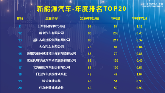 2020汽车专利创新指数分为综合得分和年度得分,其中综合得分评价对象为企业累积的全部有效专利;年度得分评价对象为企业在过去一年新增的有效专利。(注:综合得分数据截至20200630,年度得分数据范围为20190701至20200630)