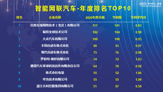 智能网联汽车领域企业年度得分排名中,TOP10企业依次为百度在线网络技术(北京)有限公司、福特全球技术公司、大众汽车有限公司、丰田自动车株式会社、现代自动车株式会社、罗伯特·博世有限公司、通用汽车环球科技运作有限责任公司、株式会社电装、华为技术有限公司、浙江吉利控股集团有限公司。国内企业占据3席,其中百度在线网络技术(北京)有限公司以117分位居第一,浙江吉利控股集团有限公司以51分排名第十,为唯一入围前十的国内整车企业。