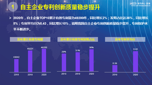 2020年,自主企业TOP10累计有效专利量为49200件,同比增长2%;发明占比达36%,同比增长5%;专利平均分为0.43,同比增长10%,说明我国自主企业专利创新质量稳步提升,专利保护水平不断进步。