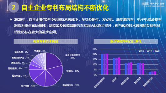 2020年,自主企业TOP10专利技术构成中,车身及附件、发动机、新能源汽车、电子电器及整车制造为重点布局领域;新能源及智能网联汽车专利占比稳步提升,但与传统技术领域的专利布局相比仍存在较大的进步空间。