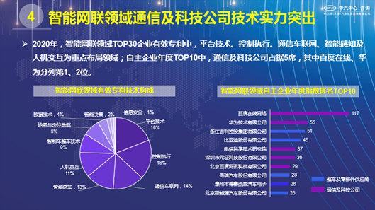2020年,智能网联汽车领域TOP30企业有效专利中,平台技术、控制执行、通信车联网、智能感知及人机交互为重点布局领域;自主企业年度TOP10中,通信及科技公司占据5席,其中百度在线、华为分列第1、2位。