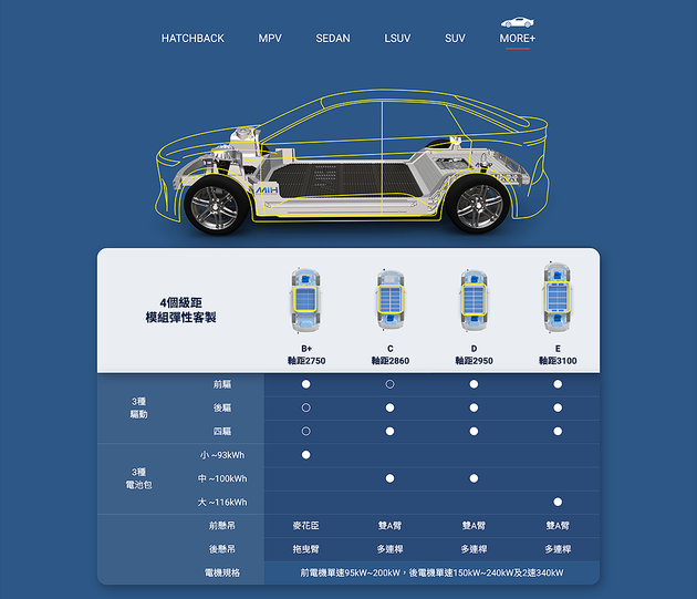 根据FOXTRON针对未来旗下产品的规划,将会提供包括掀背车、轿车、SUV、MPV在内的多款产品,轴距从2750mm一直延伸到3100mm,动力包括单电机前驱或后驱,以及双电机四驱,还有麦弗逊/扭力梁悬架,以及双叉臂/多连杆悬架的组合。