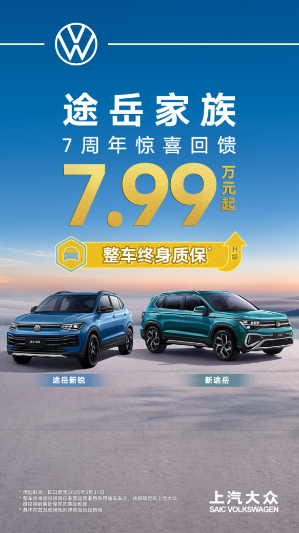 所以总体而言,上汽大众途岳家族以7周年为契机,推出“限时价+整车终身质保”双重福利,全面展现其“精湛德系品质+天花板级质价比”。这不仅是对用户长期信赖的回馈,更是上汽大众“为大众造大众车”承诺的生动实践。如此诚意与实力兼具的途岳家族,正等待着您的亲身体验,赶快进店感受吧!