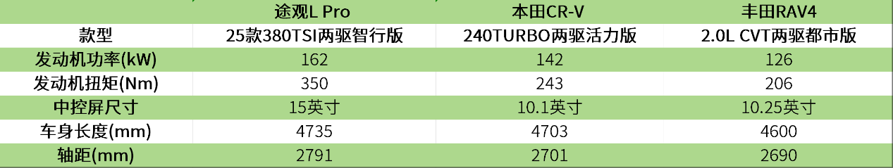 在配置上,途观L Pro同样越级领先。同级罕见的双联屏设计,15英寸中控屏搭配11.6英寸副驾娱乐屏,为驾驶者和乘客带来了更加丰富的视觉体验。而CR-V的10.1英寸中控屏和RAV4的10.25英寸中控屏,不仅尺寸较小,而且均无副驾娱乐屏,在科技感和豪华感上与途观L Pro相差甚远。
