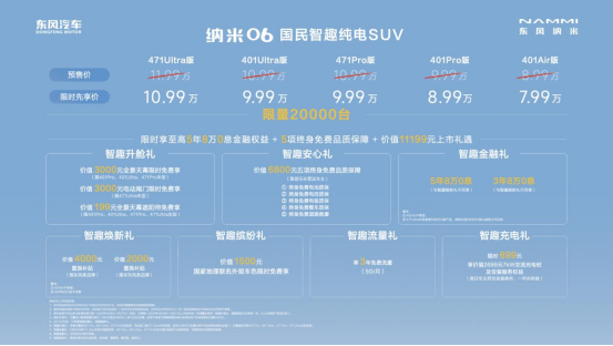 5月27日,武汉这座充满活力的城市见证了一场汽车界的盛事——东风纳米旗下“国民智趣纯电SUV”东风纳米06正式上市。新车限时先享价区间为7.99万元 - 10.99万元,以极具竞争力的价格,为消费者带来超越期待的出行体验。