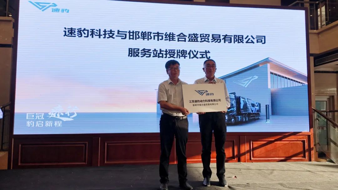 与此同时,速豹科技与邯郸市维合盛贸易有限公司借本次战略签约暨交付仪式,进行了服务站授牌仪式。总经理王彦东表示,公司将以本土完善的服务网络为依托,坚守“以客户需求为中心,助力客户成功”的服务宗旨,践行速豹7×24小时全天候服务响应,为本地市场速豹电动重卡的运营与售后保驾护航。