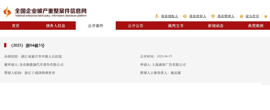 2025 年 6 月 13 日,全国企业破产重整案件信息网显示,哪吒汽车关联公司合众新能源汽车股份有限公司破产审查案件更新信息,新增管理人机构浙江子城律师事务所。6 月 19 日,该破产案件再次更新,引起了广泛关注。