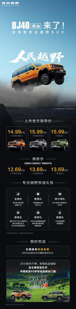 7月19日,北京越野新品发布会在张家口天地梁盛大举行,这场发布会犹如一颗投入平静湖面的巨石,在越野圈激起千层浪。BJ40燃油定位为全场景专业越野SUV,携汽油标准版、汽油进阶版、柴油版三款车型闪亮登场,官方指导价14.99—15.99万元,焕新价最低只需12.69万元起(叠加国补和厂端置换后),如此亲民的价格,瞬间吸引了众多越野爱好者的目光。