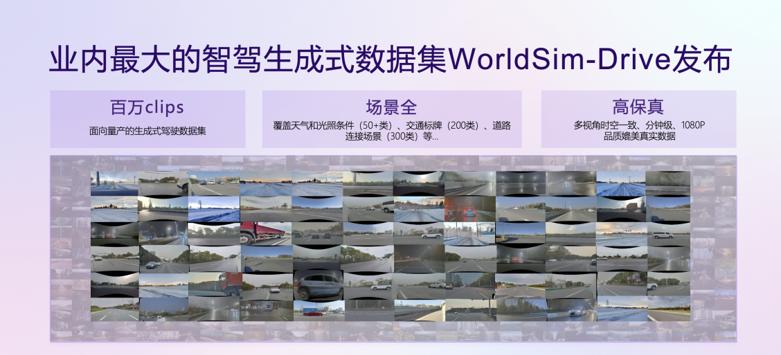 不止如此,商汤绝影还发布业内最大规模的生成式驾驶数据集“WorldSim-Drive”。借助“开悟”世界模型,绝影已生产超100万clips面向量产的生成式数据,场景类型覆盖全面,包括50多类天气和光照条件、200类交通标牌和300类道路连接场景等。而且绝影的生成式驾驶数据能实现多视角时空一致、时长可达分钟级、分辨率达1080P品质媲美真实数据。