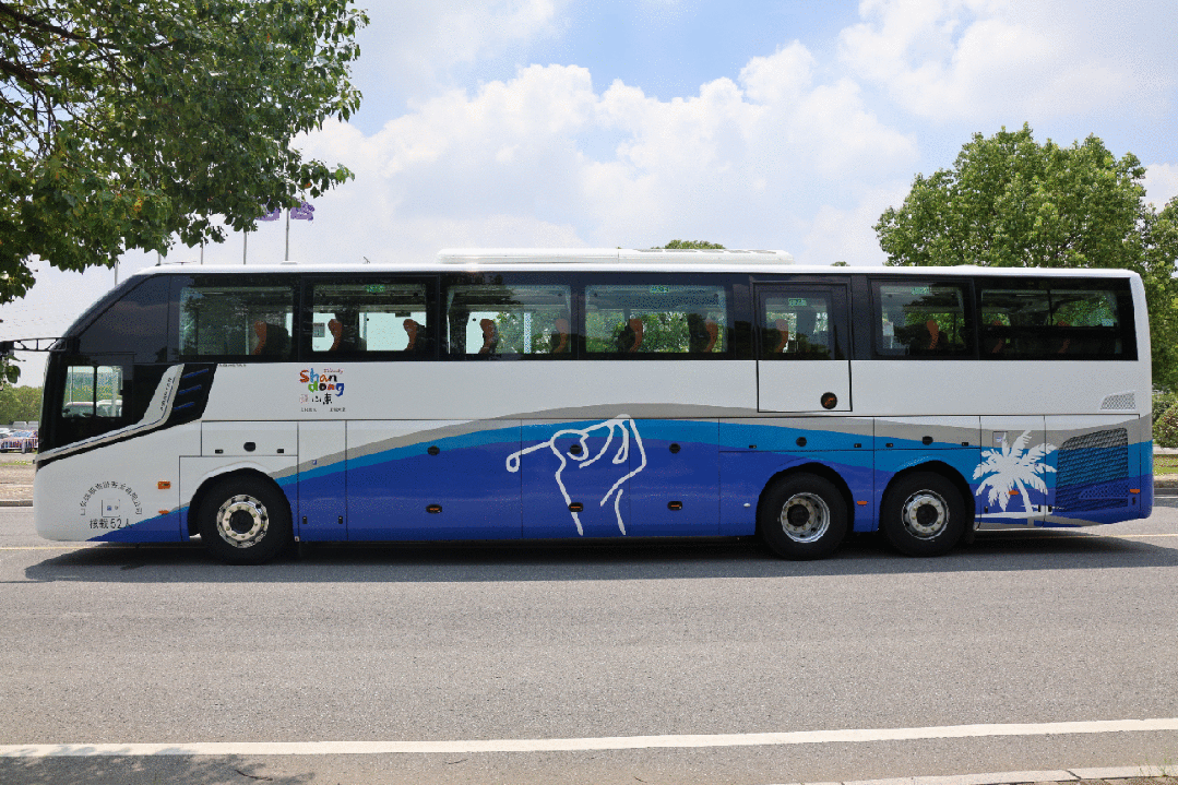 车身涂装围绕山东文旅品牌“好客山东”展开,其核心视觉符号——彩色手写体“Shandong”,搭配品牌宣传语“文化圣地 度假天堂”,更融入“高尔夫挥杆”——呼应山东休闲度假资源、“椰树”——象征滨海风光等创意元素,让其成为“行走的山东文旅宣传册”!
