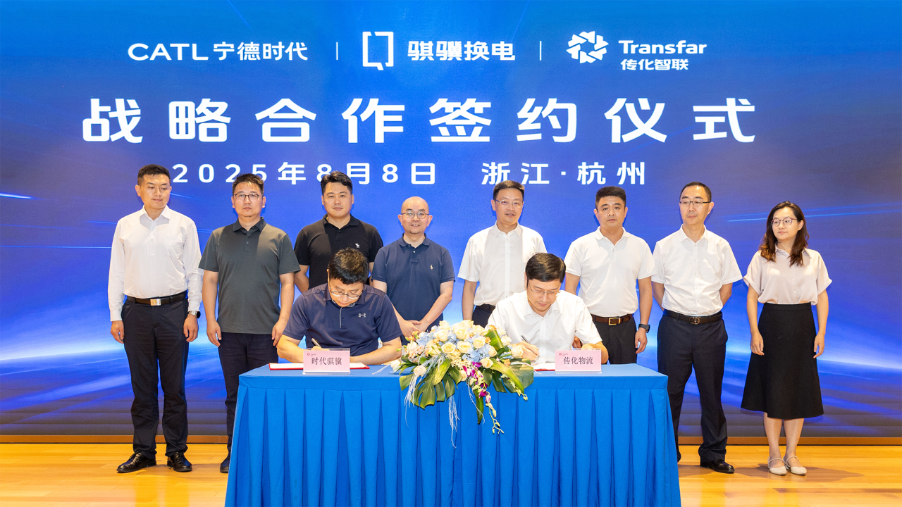2025年8月8日,时代骐骥与传化智联旗下传化物流集团在浙江杭州正式签署战略合作框架协议。双方将合作建设新能源补能网络并推动多场景深度融合,通过数据互通与生态协同,实现物流节点与能源补能的无缝衔接,加速构建低碳高效物流新体系。