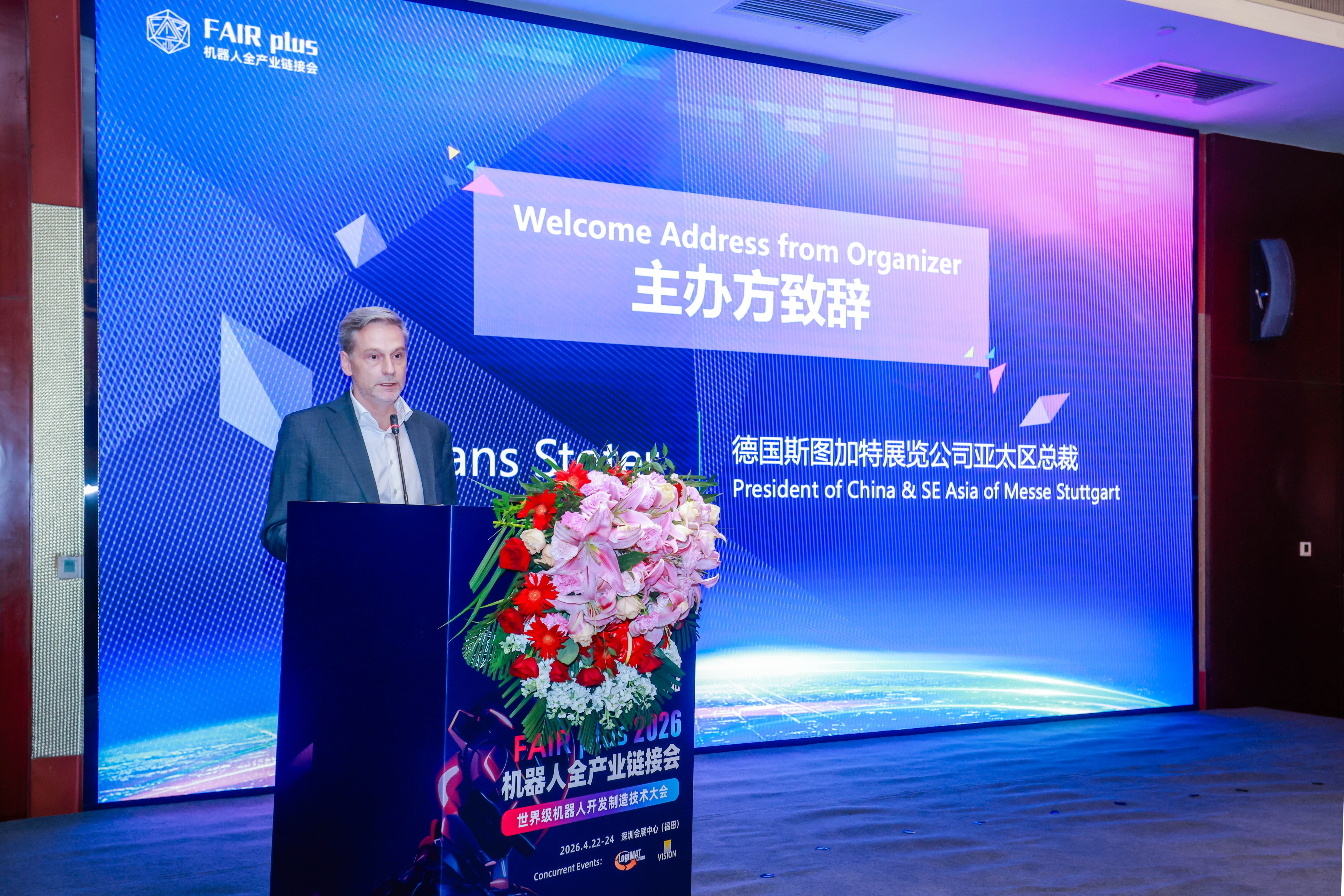 发布会现场,德国斯图加特展览中国及亚太区总裁Hans Stoter(宋瀚思)开场致辞。他指出,FAIR plus旨在打造面向全球的机器人开发技术与选型采购平台,为海内外机器人企业提供从零部件、算法模型到整机系统的全产业链对接机会。作为德国领先的专业展会运营机构,斯图加特拥有丰富的展览经验和资源网络,将为FAIR plus提供成熟的运营保障和国际推广通道,助力展会在全球范围内吸引优质技术企业与创新项目。