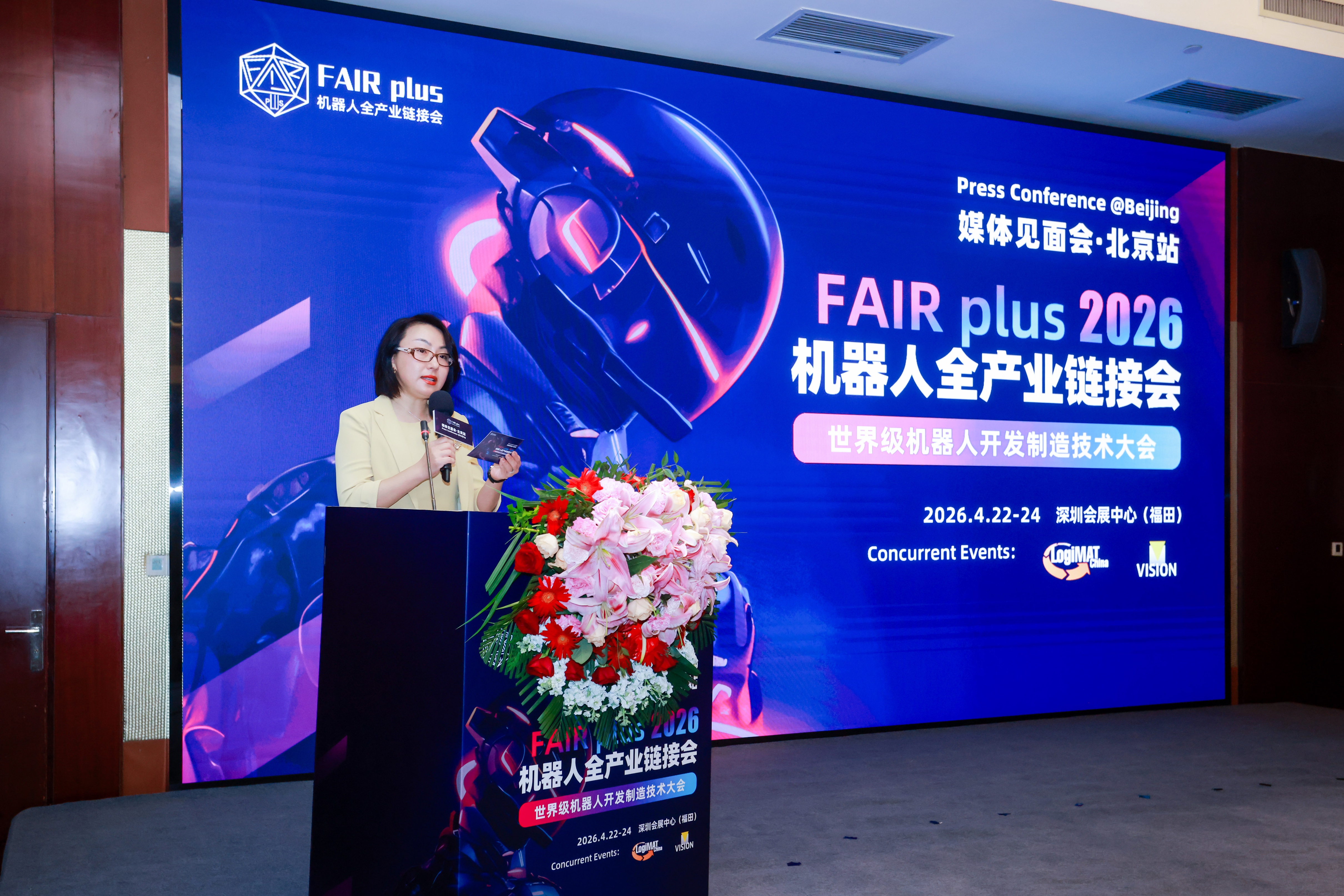 随后,深圳市机器人协会专职秘书长谭维佳介绍了展会的核心规划与落地路径。她指出,FAIR plus定位为“机器人产业链专展”,其核心在于对 “开发” 环节的重点聚焦。