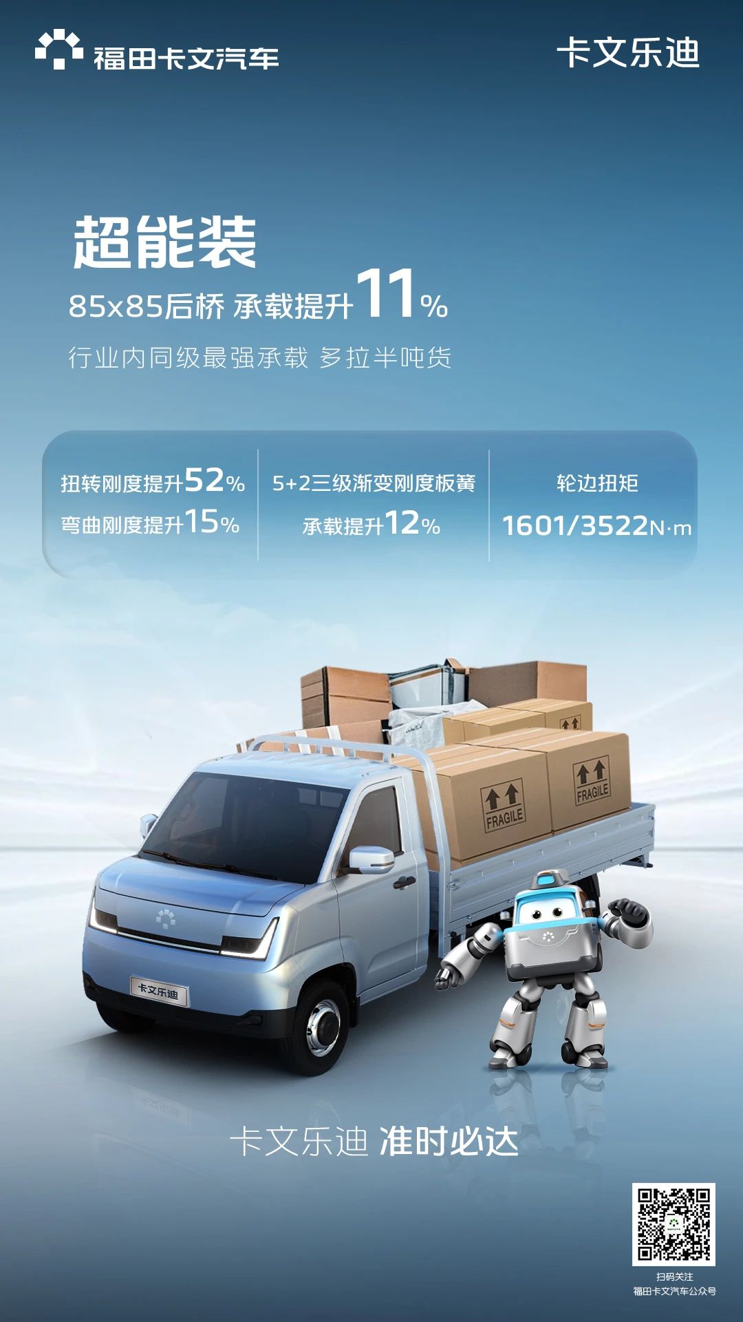 从动画荧幕驶入现实物流,超级飞侠乐迪“准时送达”的承诺,在福田卡文乐迪身上找到了坚实的现实依托。它以“航空级效率”为内核,融合澎湃高效动力、强大承载空间与全面安全科技三大核心优势,重新定义了高效小卡的价值标杆。