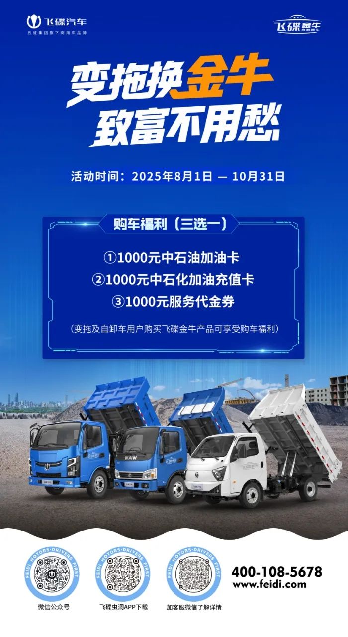 为了回馈广大用户的信赖与支持,助力大家轻松升级座驾、开启致富新征程,飞碟汽车即日起重磅推出“变拖换金牛,致富不用愁”限时回馈活动!活动期间换购飞碟金牛系列,即可领取千元豪礼!