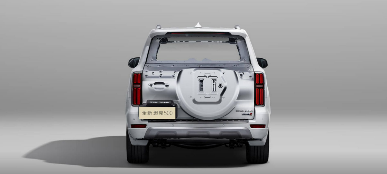 车尾部分变化相对较小,继续配备外挂式备胎,彰显越野属性。尾灯设计灵感来源于皇家的宫灯造型,被称为 “宫阙之眸尾灯”。纵向设计下长上短,如宫灯垂挂时的沉稳姿态;横向设计则遵循左右严格对称的法则,延续了宫灯造型中蕴含的平衡之美。对称、沉稳的设计语言让新车车尾整体方正厚重,视觉上稳当可靠,两侧尾灯共计八个红色灯条,寓意着四平八稳。尾标新增 “GWM” 标识,贯彻坦克品牌全球化战略,提升品牌辨识度。