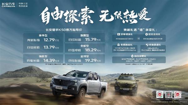 8月29日,“自由探索 无限热爱——长安猎手新价值分享暨K50全系上市发布会”在成都车展举行。长安猎手K50正式推出豪华型、领航型及旗舰型等6款车型,覆盖两驱与四驱、标箱与长箱多元组合,售价12.79万元起,购车即可享受9.9元定金抵999元现金补贴和非营运首任车主享三电系统、增程系统终身质保等多重好礼,以极具竞争力的产品力与诚意价格,助力用户开启全新皮卡生活方式。